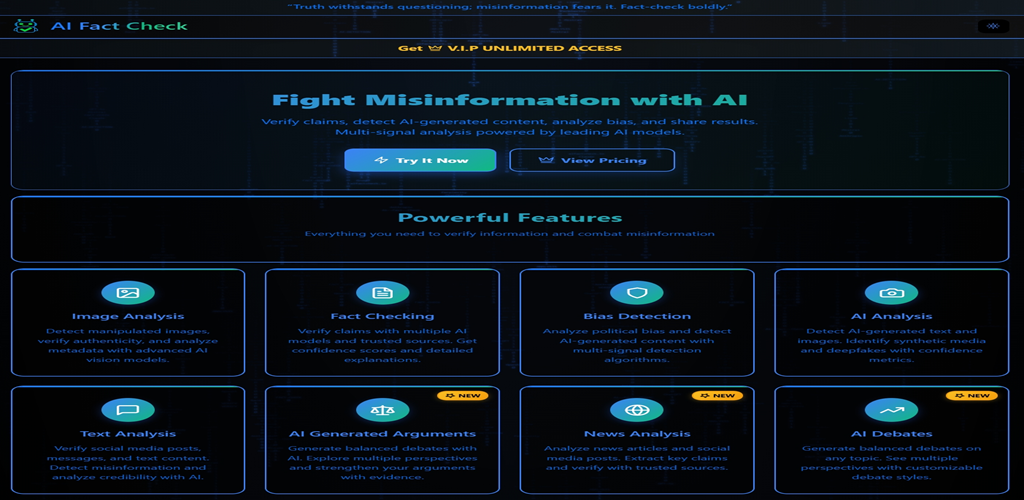 Verify claims, detect AI-generated content, analyze bias, and share results. Multi-signal analysis powered by leading AI models.